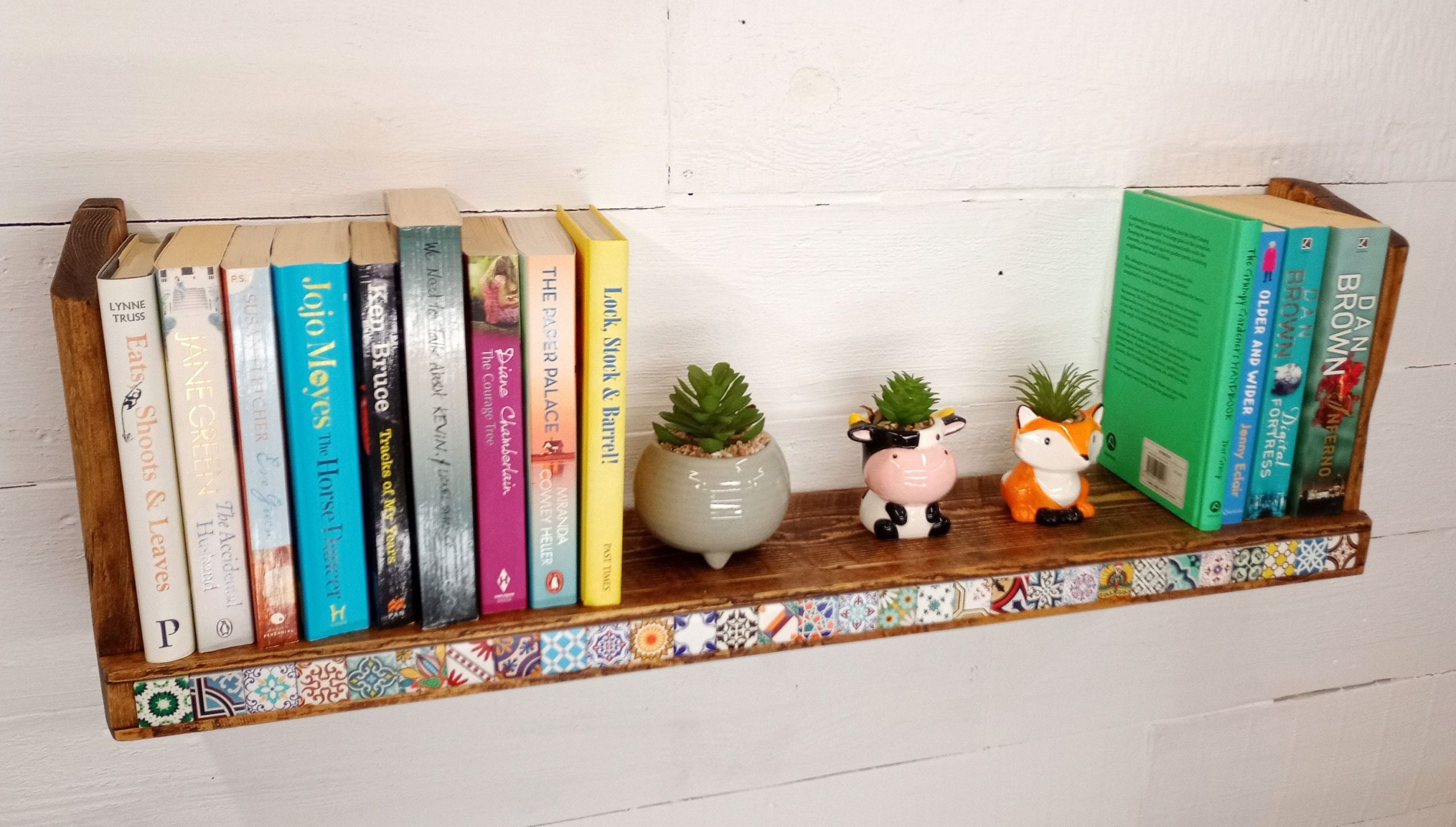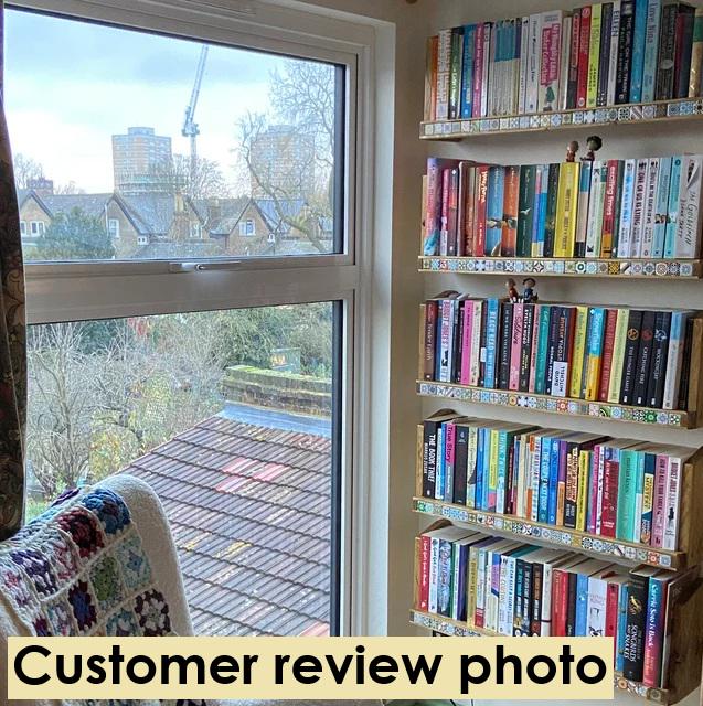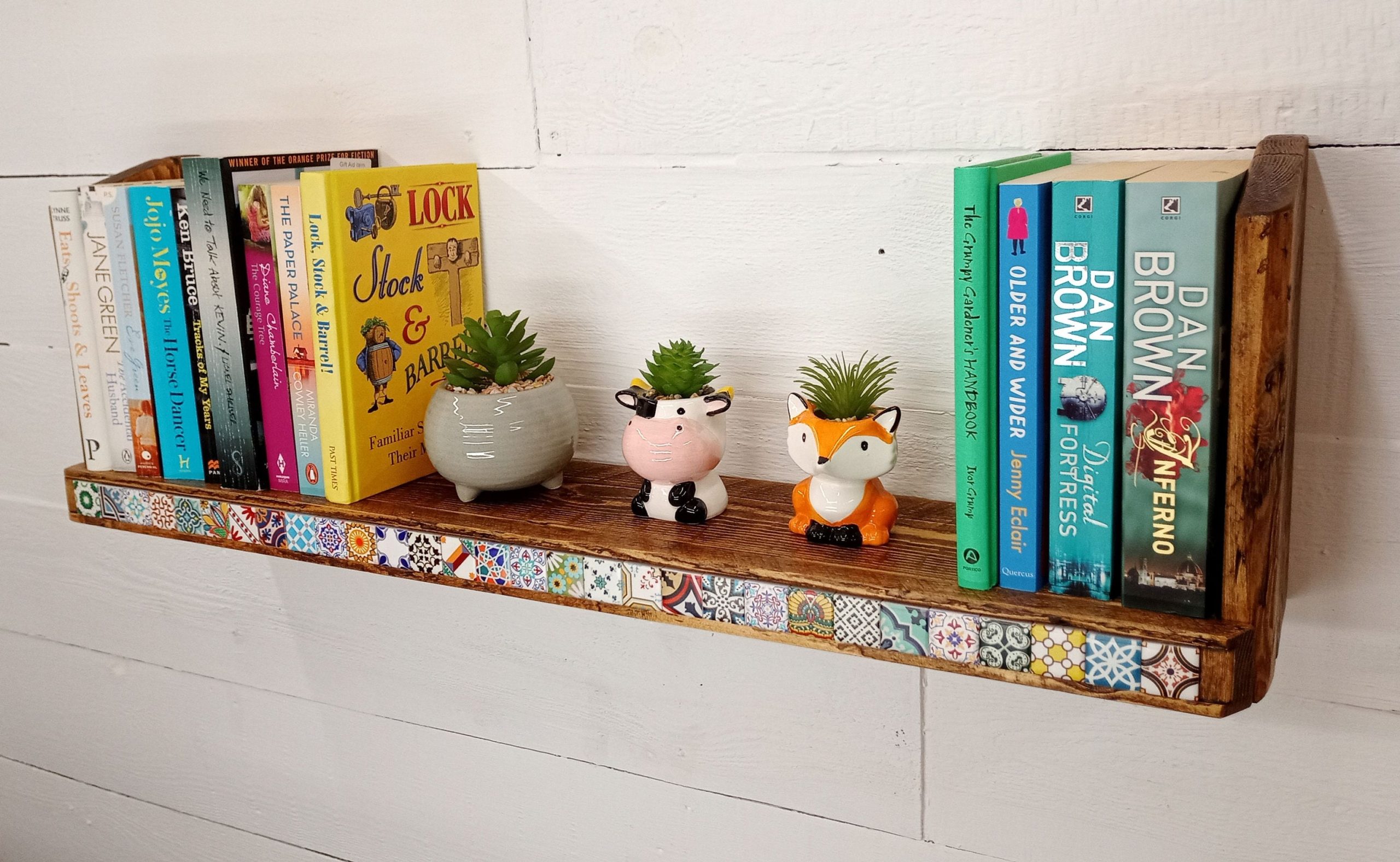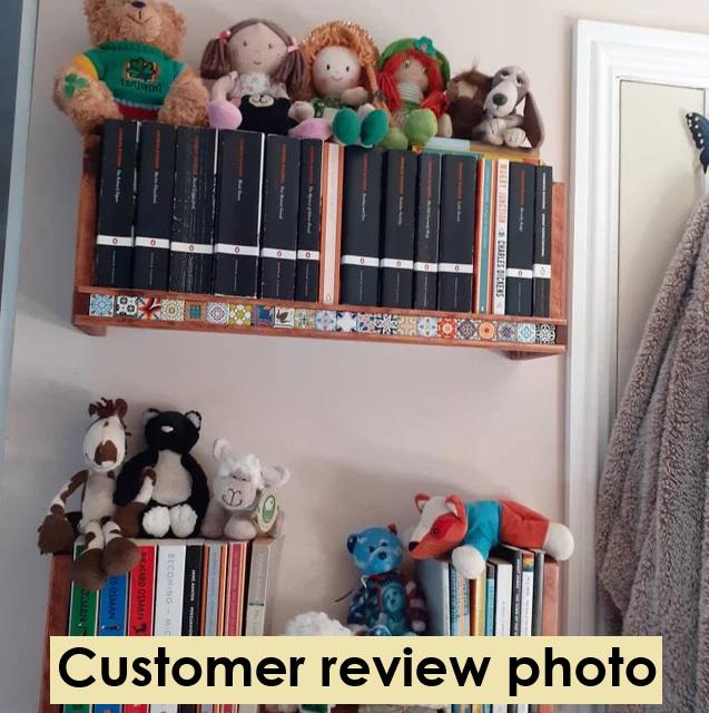 – Each shelf is unique, with natural wood grain and tile variations
